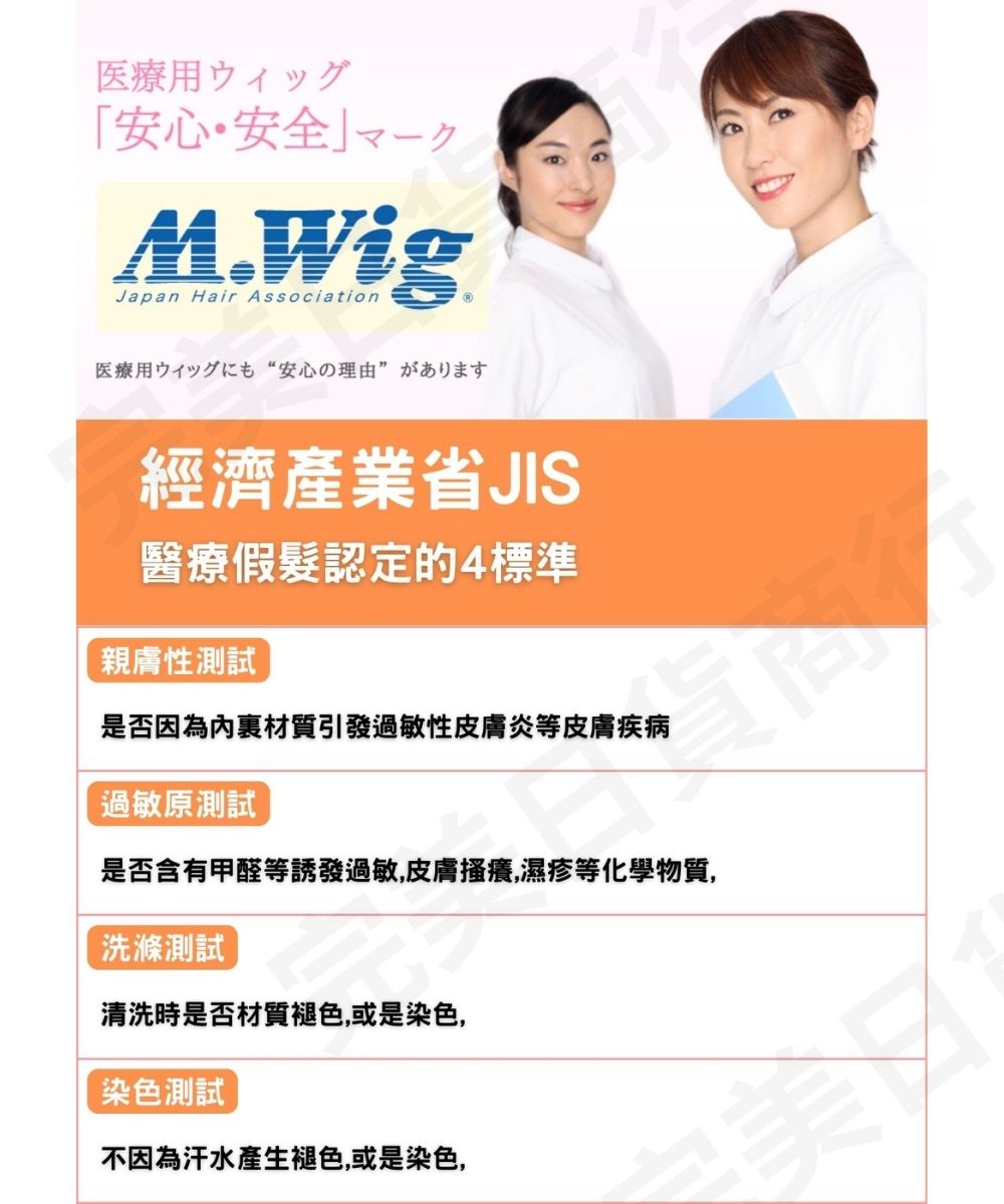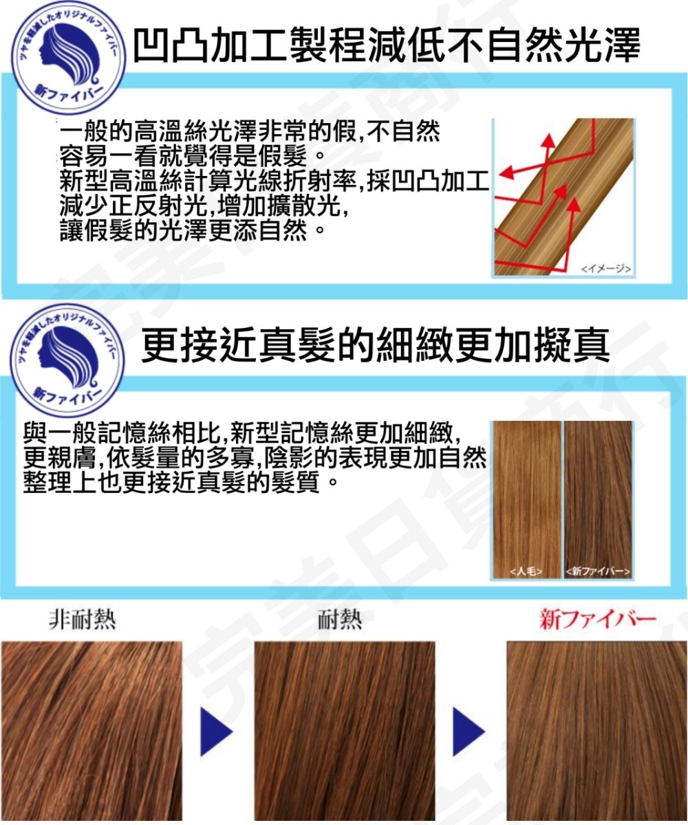 外觀部分選用日本國產新型記憶絲,質地輕盈,比真髮更輕,減少頭部負擔;經過特殊光澤處理,髮絲自然不假、仿若天生。高級人工皮髮旋設計,即使從上方俯視也難以察覺是假髮,提升真實感與自信。